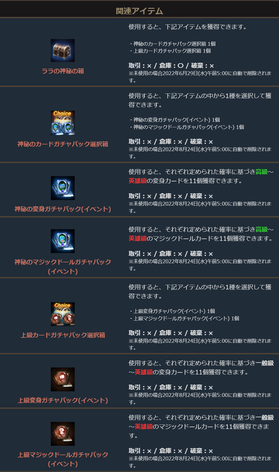※一部アイテムは未使用の場合、一定期間が経過すると自動で削除されます。詳しくは各アイテムの詳細をご確認ください。