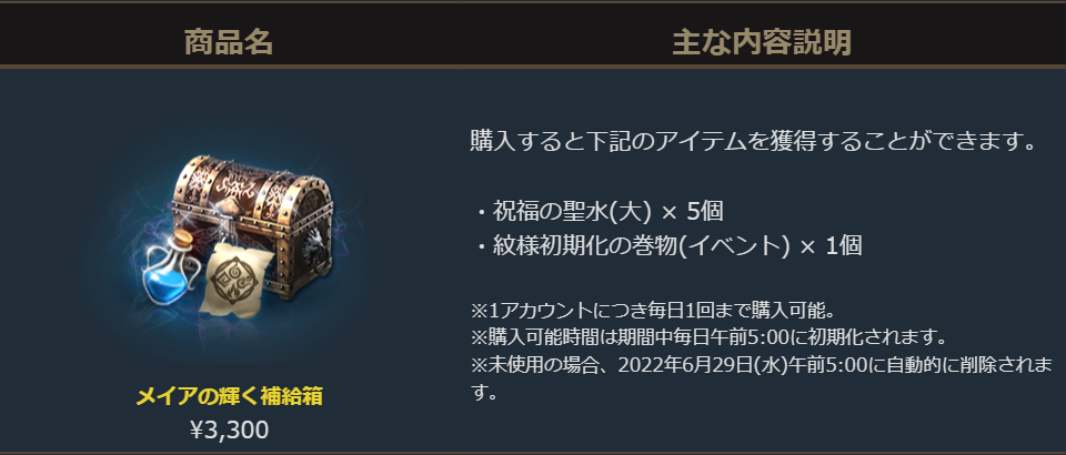 毎日購入可能で、紋様の強化や初期化に役立つ各種アイテムがが獲得できるパッケージです。