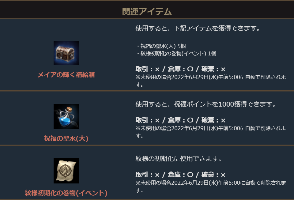 ※一部アイテムは未使用の場合、一定期間が経過すると自動で削除されます。詳しくは各アイテムの詳細をご確認ください。