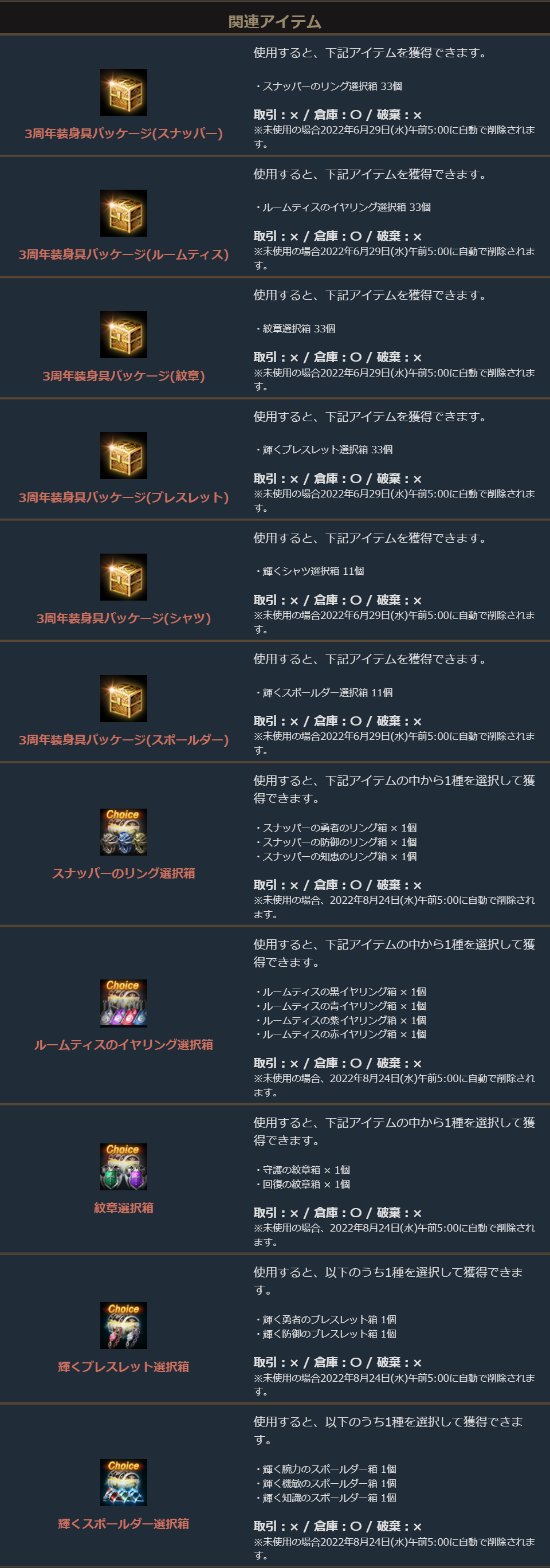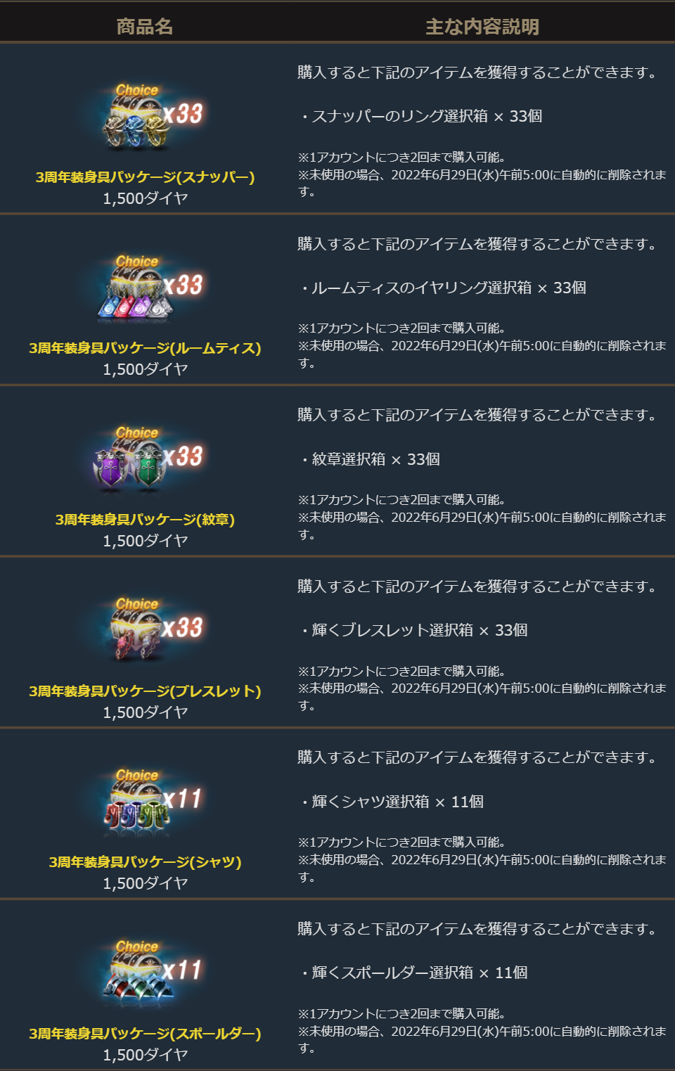 各種装身具をお得に獲得できる商品となっておりますので、所持してない方や強化に挑戦したい方はお見逃しなく!