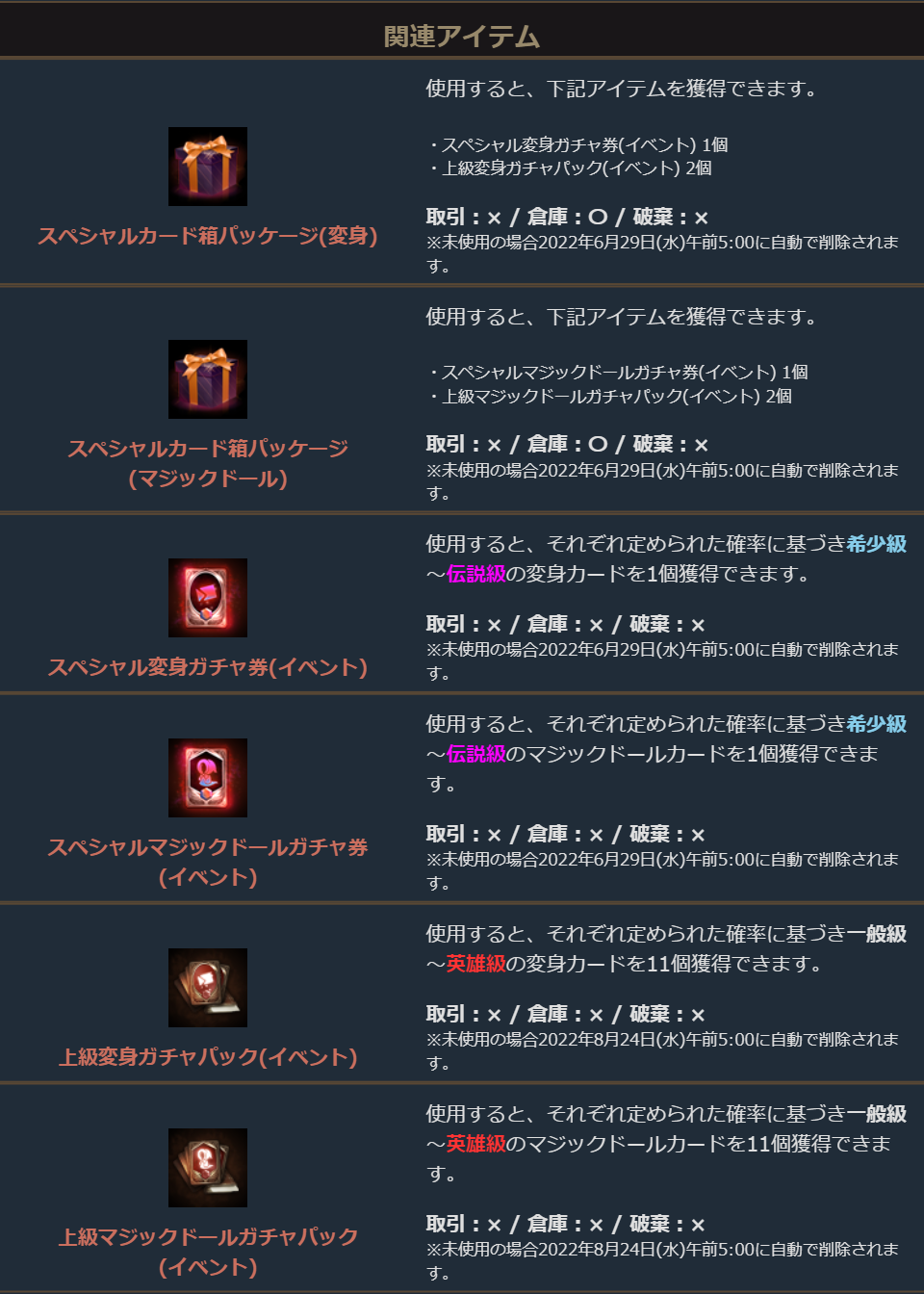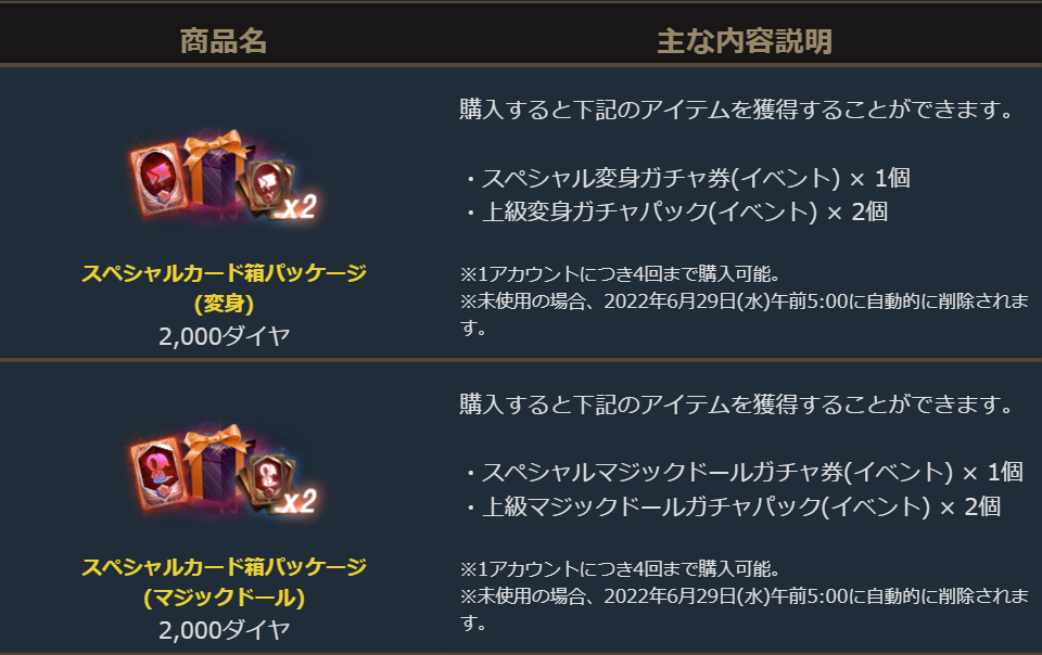 希少級以上が確定で獲得できる「スペシャル変身/マジックドールガチャ券」など、カードの獲得に便利な2種類のパッケージです。