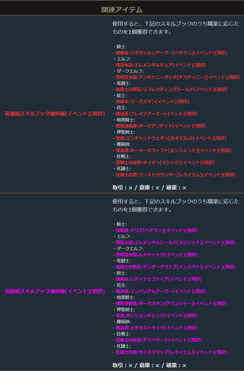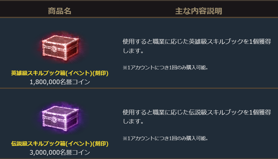 期間中、ゲーム内「ショップ」>「名誉コイン」から、各職業の一部スキルブックを選択して獲得できるスキルブック箱を購入できます。