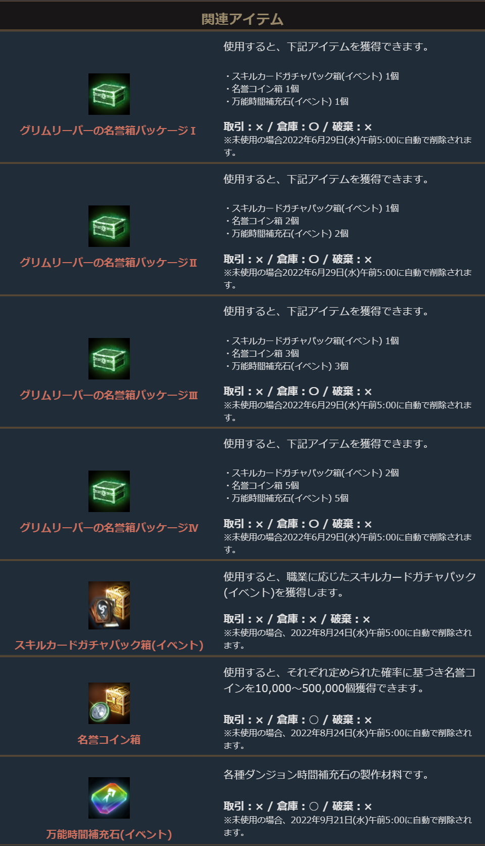 ※一部アイテムは未使用の場合、一定期間が経過すると自動で削除されます。詳しくは各アイテムの詳細をご確認ください。