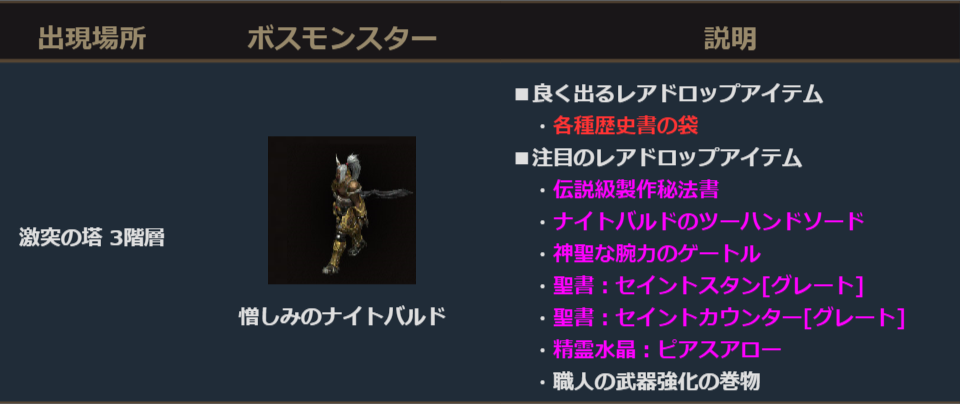 特定の時間に出現するボスモンスターは、監視者リーパー討伐時に出現するボスよりも価値の高いアイテムがドロップしやすくなっております。