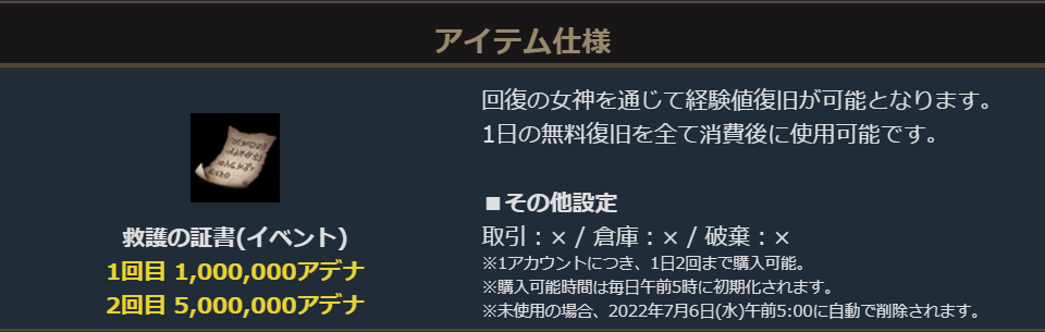 激突の塔開催を記念して、下記の期間はショップから「救護の証書(イベント)」をアデナで入手できます。
