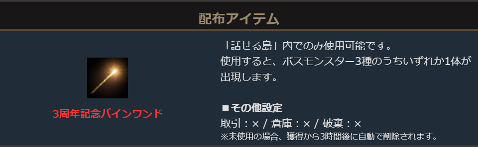 イベント期間中の毎週金曜/土曜/日曜の正午(12:00)に、グンターサーバー内全てのアカウントへ「3周年記念パインワンド」を郵便にて3個ずつ配布いたします!