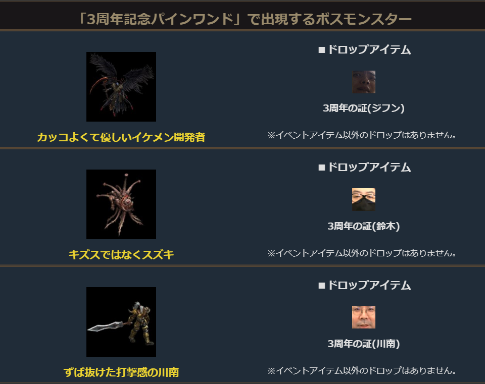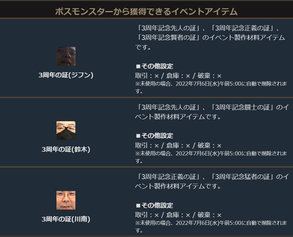 イベント期間中、ボスモンスターからドロップする各種「3周年の証」を材料として「3周年記念賢者/闘士/猛者/正義/先人の証」を製作できます。
