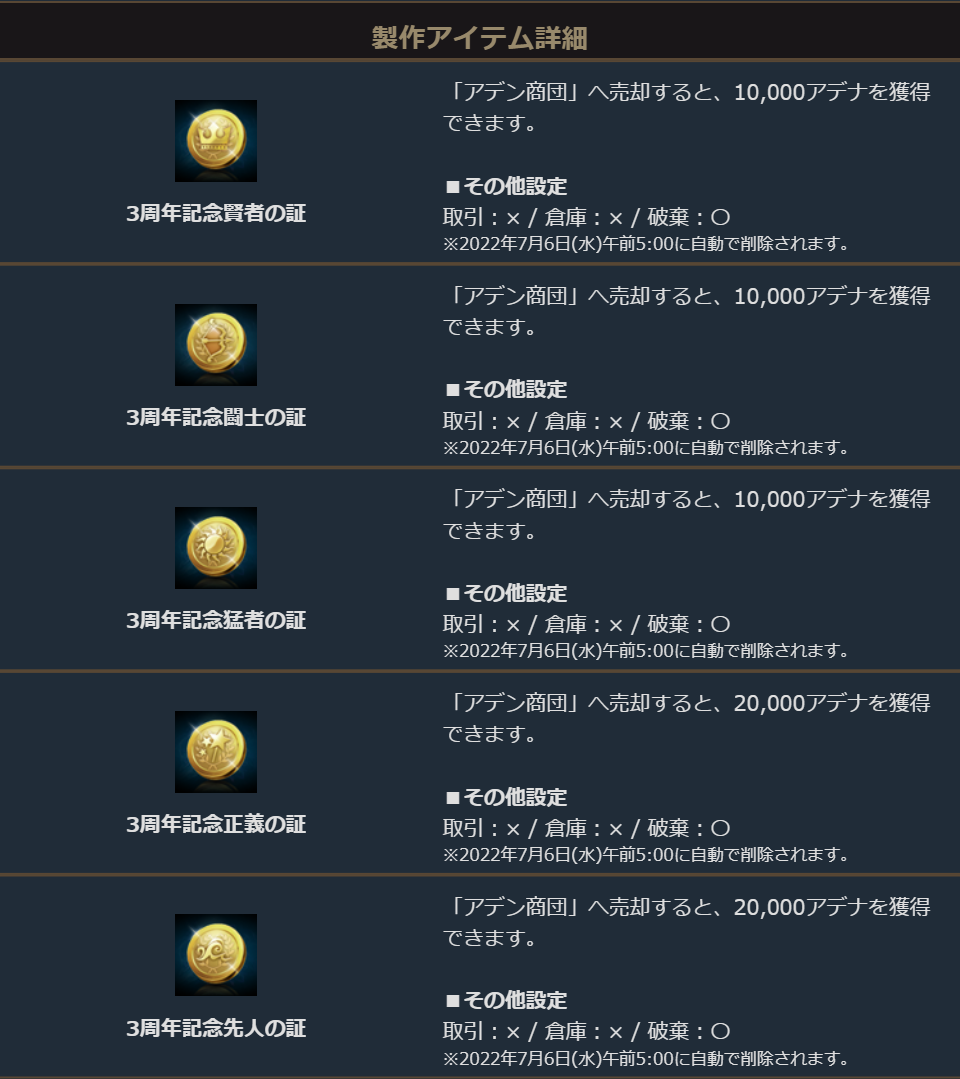 「3周年記念賢者/闘士/猛者/正義/先人の証」は村にいるアデン商団へ売却することでアデナに変換できるアイテムのため、たくさん製作してアデナを稼ぎましょう!