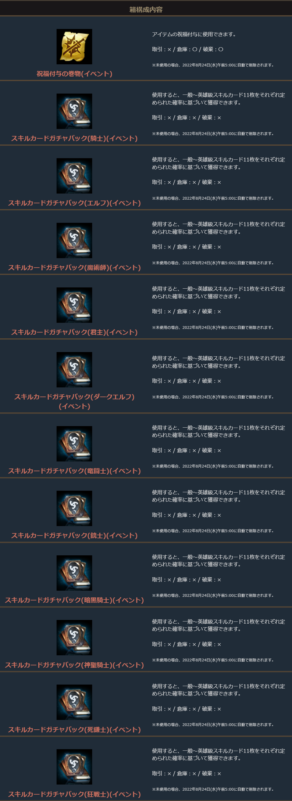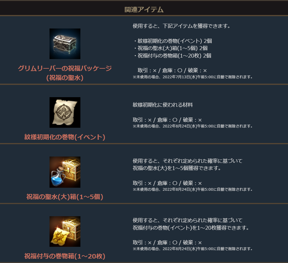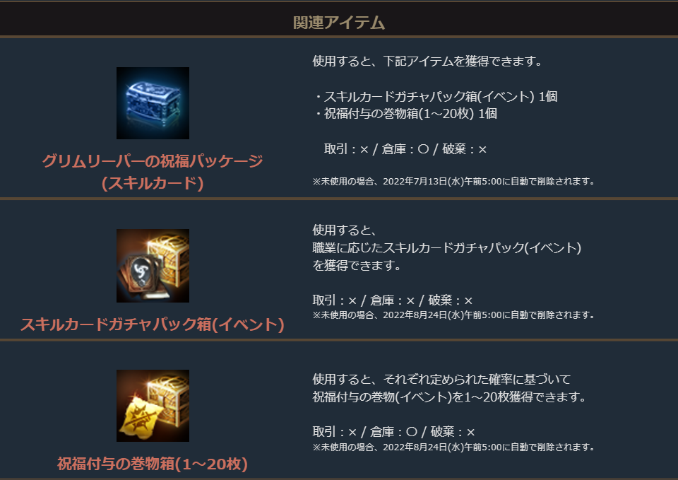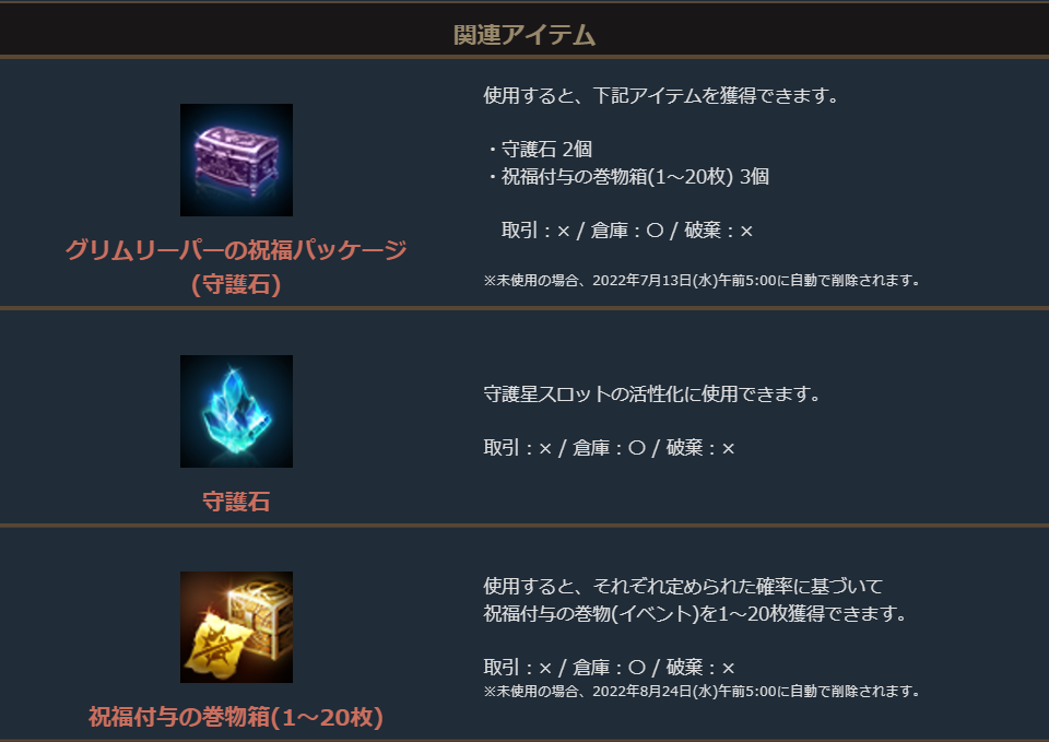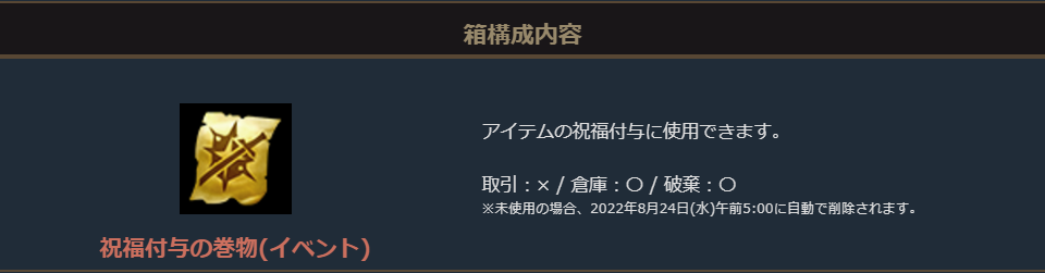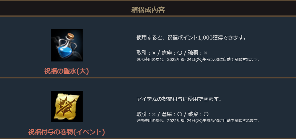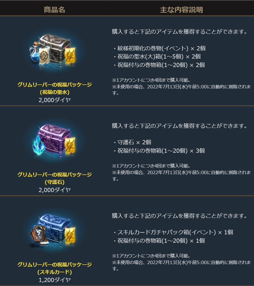 「祝福付与の巻物箱(1~20個)」に加えて、「祝福の聖水(大)箱(1~5個)」か「守護石」、または「スキルカードガチャパック箱(イベント)」がセットになったお得なパッケージです。