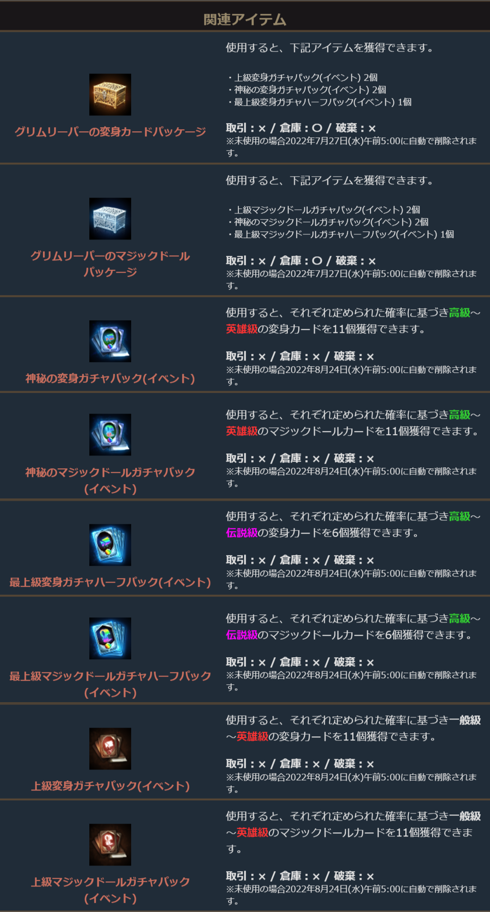 ※一部アイテムは未使用の場合、一定期間が経過すると自動で削除されます。詳しくは各アイテムの詳細をご確認ください。