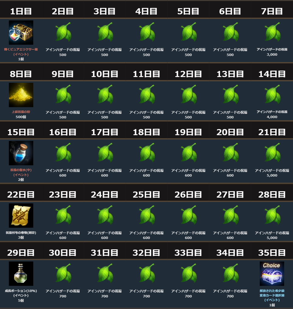 36日目以降は、出席報酬として以下の報酬を受け取ることができます。