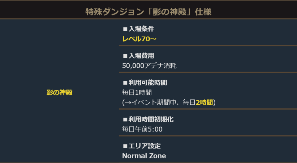 「影の神殿」はレベル70~で利用可能な特殊ダンジョンです。