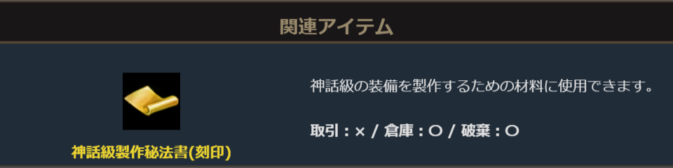こちらはゲーム内メニューの「製作」>「限定」>「神話級製作秘法書」より製作が可能です。