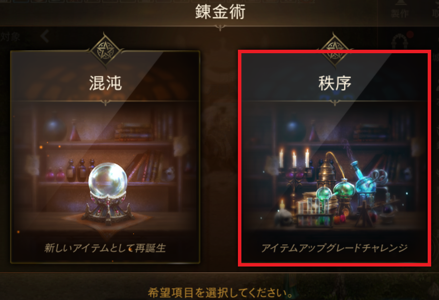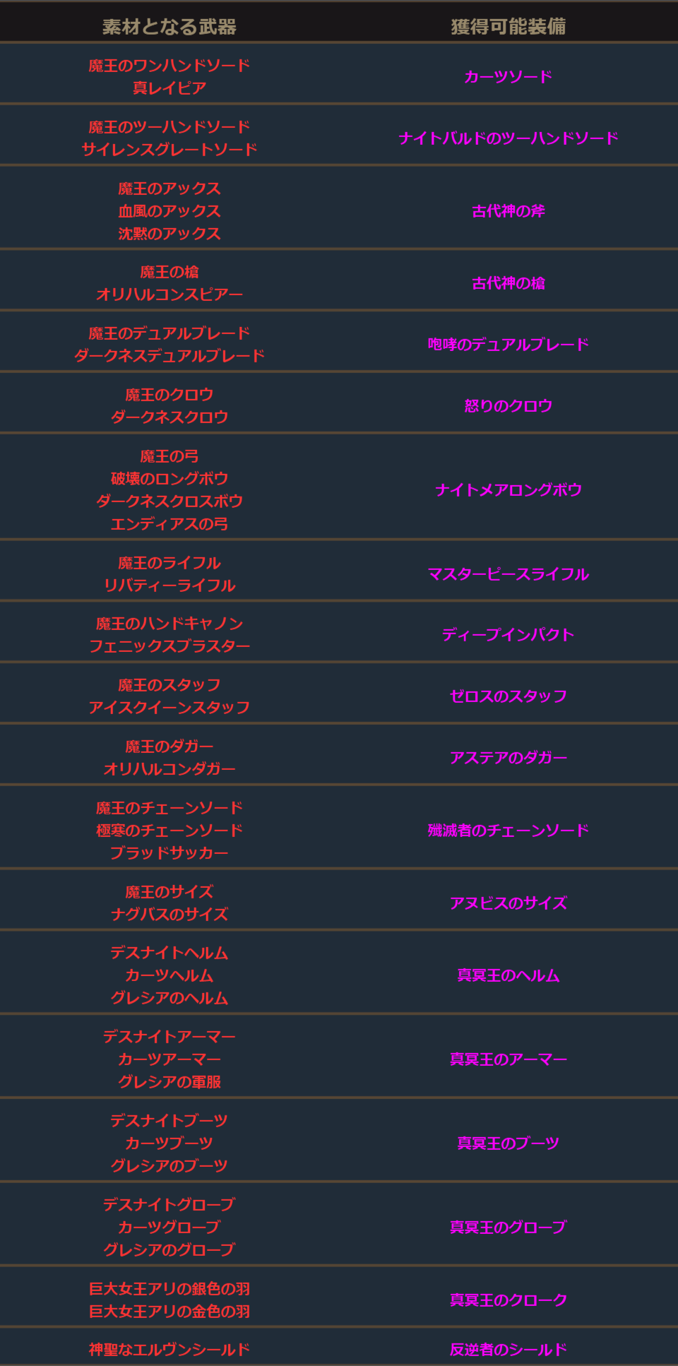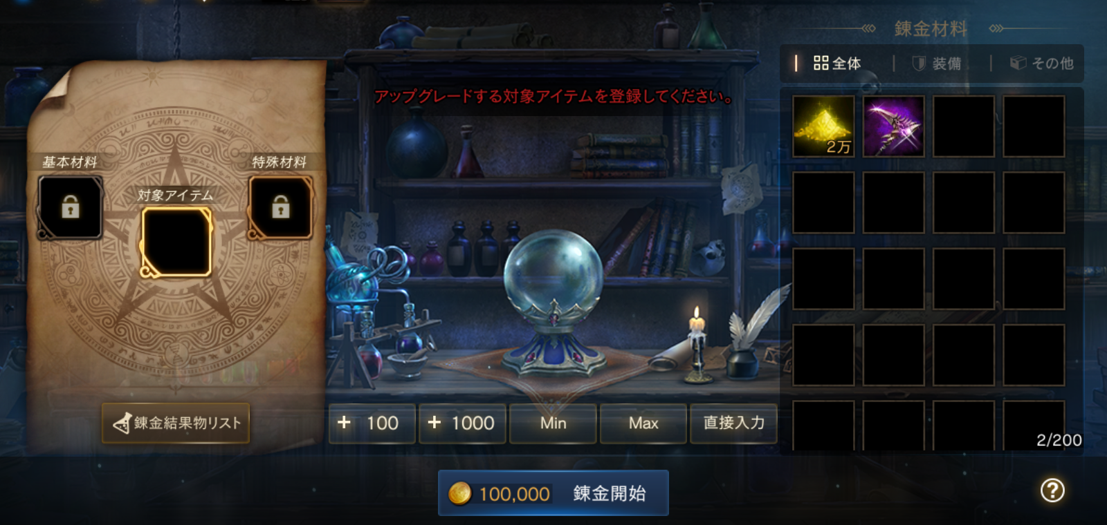 特定の英雄級装備と「上級祝福の粉」を素材として錬金を行い、成功すると素材に使用した装備の上位アイテムが獲得できます。