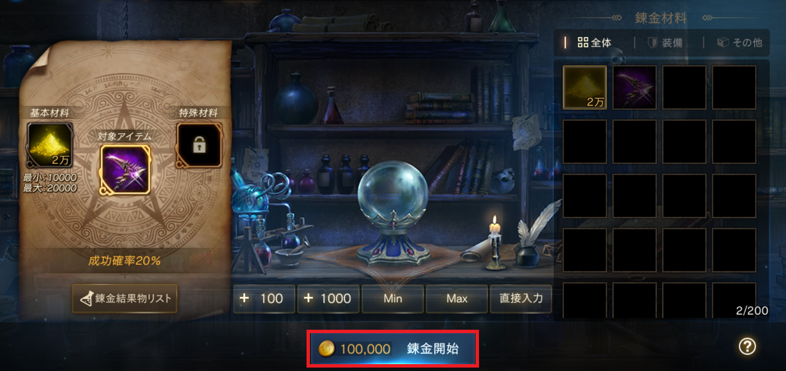 「上級祝福の粉」は素材アイテムの種類や強化値に応じた指定の範囲で個数を指定して登録することができ、多いほど錬金成功確率が上昇します。(最大20%)