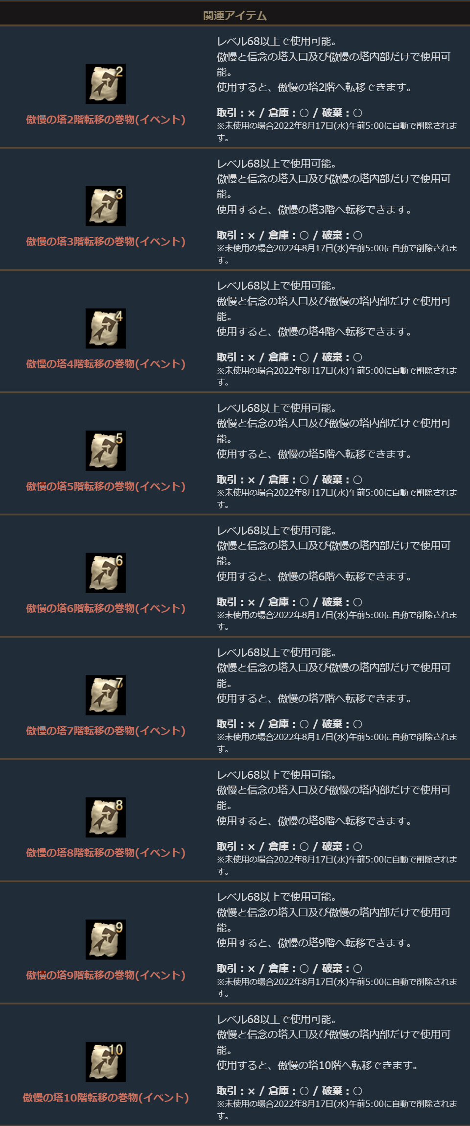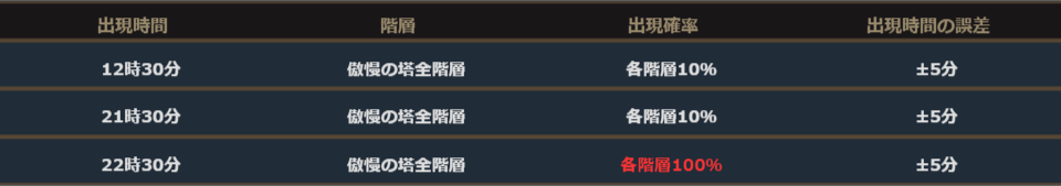 ・イベント期間中ワールドダンジョン「傲慢の塔」の、ボスモンスターの出現する時間が変更になります。
