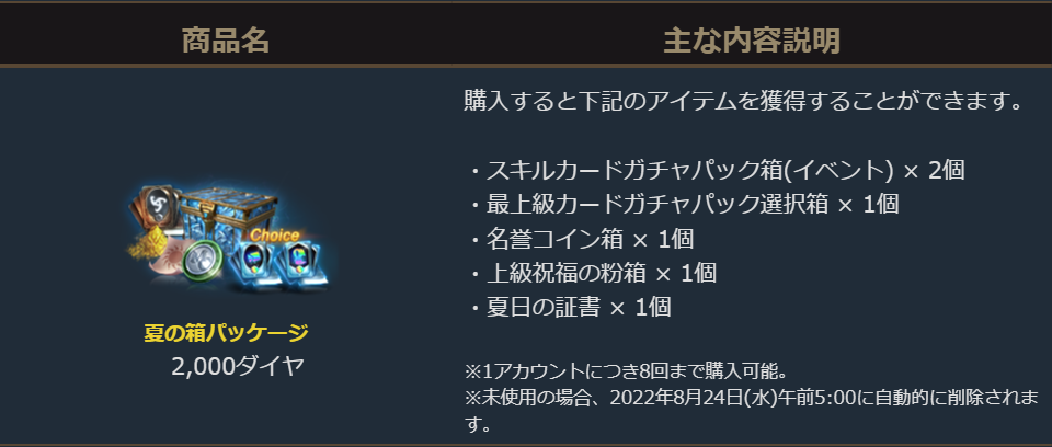 「最上級カードガチャパック選択箱」に「スキルカードガチャパック箱(イベント)」や「名誉コイン箱」「上級祝福の粉箱」等が付いてくるパッケージです。
