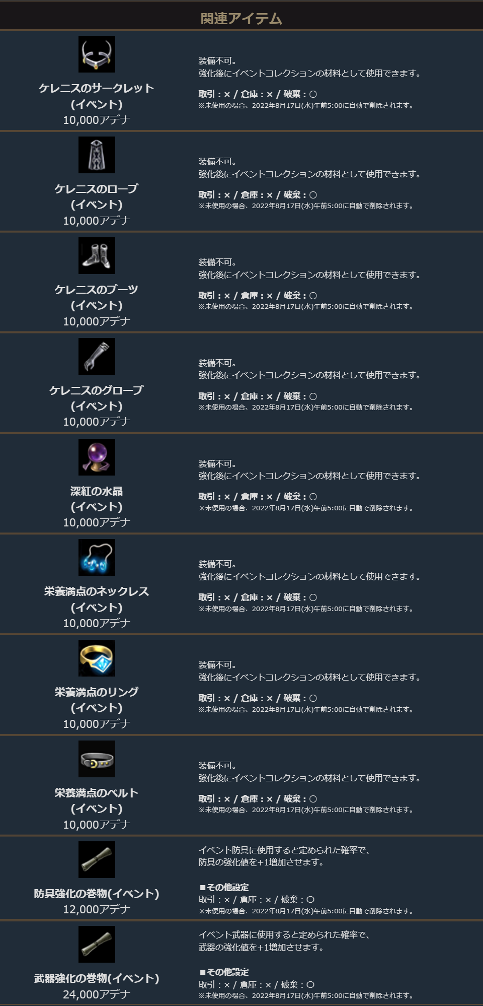 イベントNPCパンドラ[思い出のアイテム商人]からは下記のアイテムが購入可能です。