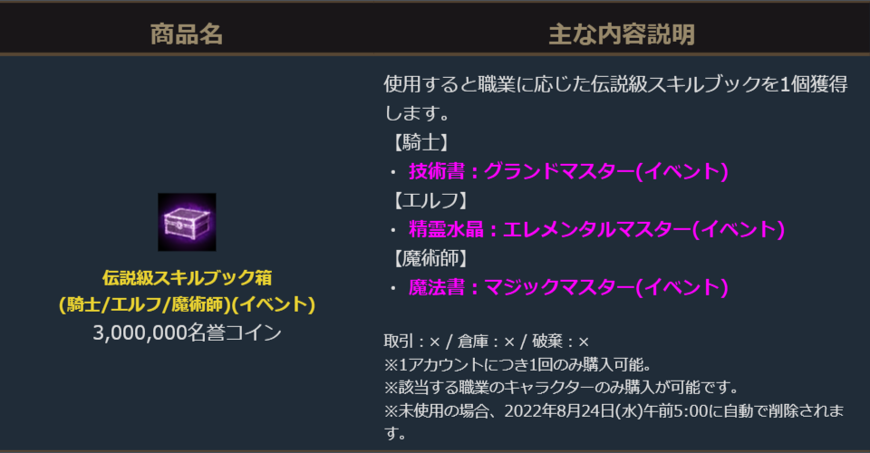 イベント期間中ゲーム内ショップの「ショップ」>「名誉コイン」にて「伝説級スキルブック箱(騎士/エルフ/魔術師)(イベント)」交換を行います。