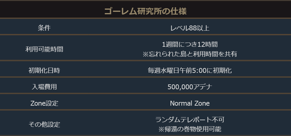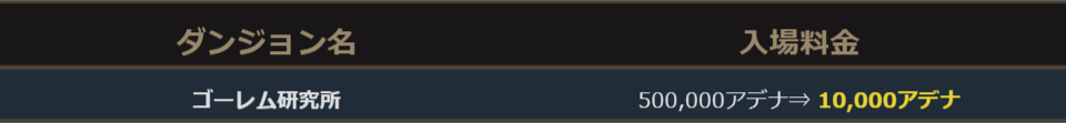 イベント期間中、ワールドダンジョン「忘れられた島」にて「ゴーレム研究所」の入場に必要な費用が緩和されます。