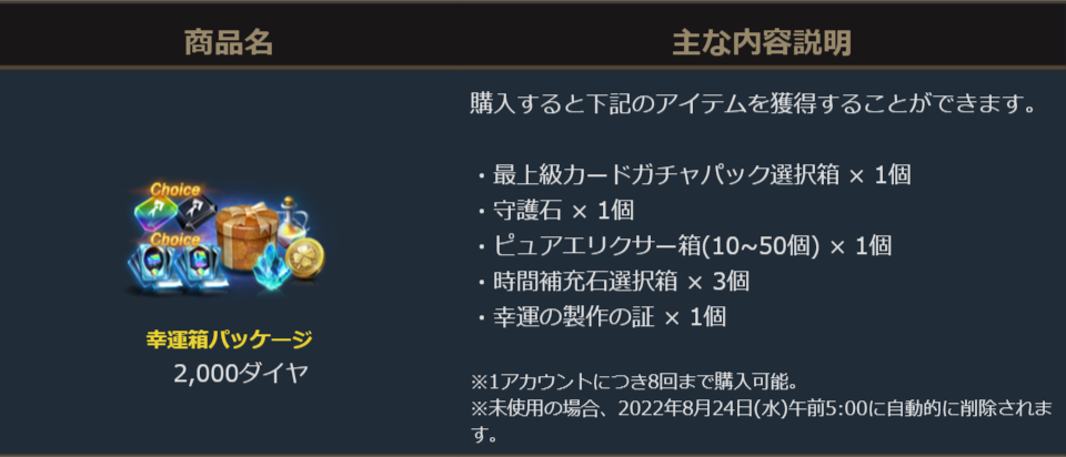 「最上級カードガチャパック選択箱」に「守護石」や「ピュアエリクサー箱(10~50個)」「時間補充石選択箱」等が付いてくるパッケージです。