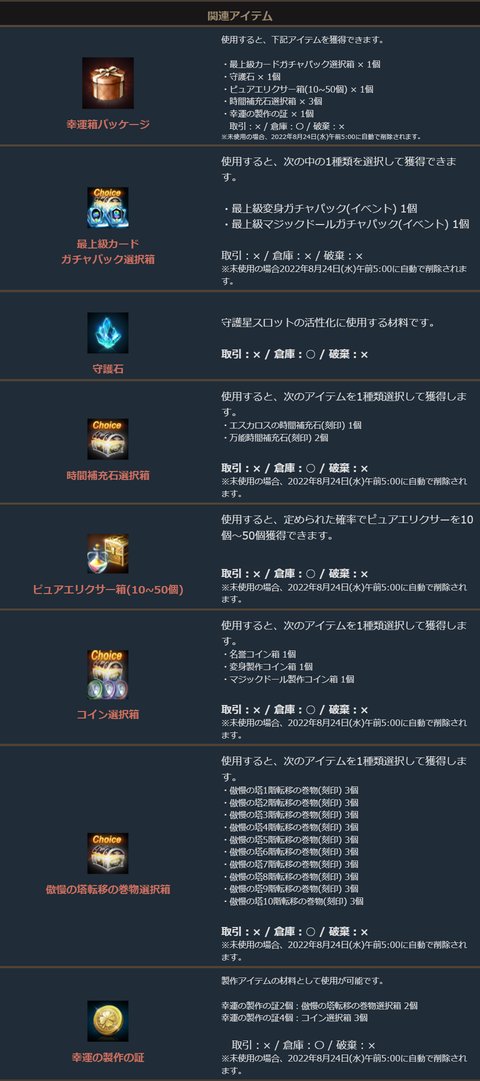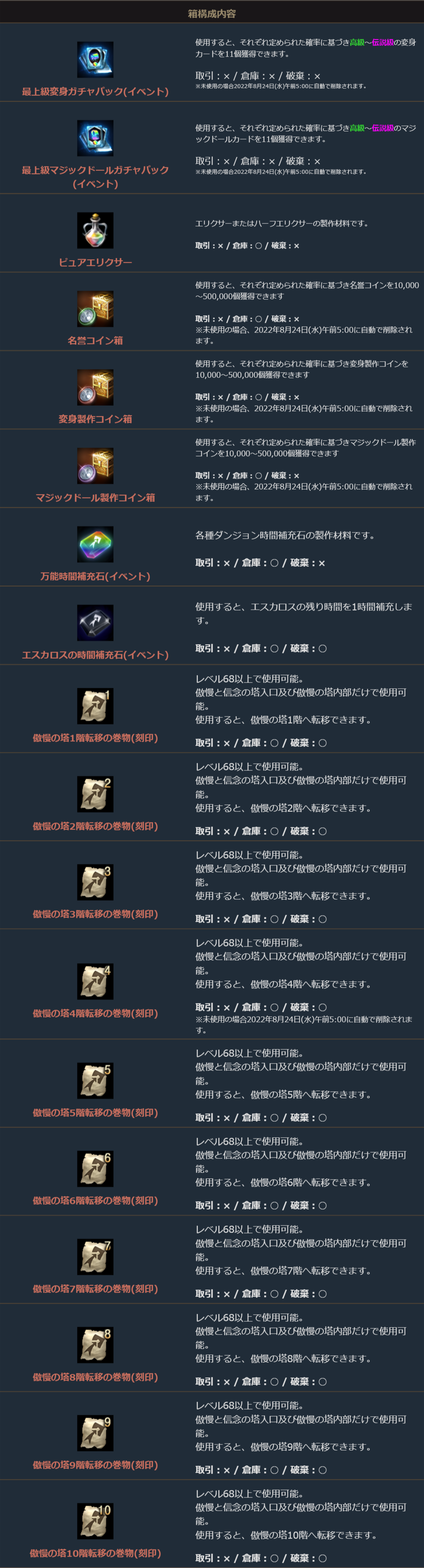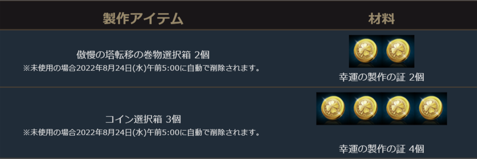 また、付属の「幸運の製作の証」は「コイン選択箱」と「傲慢の塔転移の巻物選択箱」を製作出来るアイテムとなっております。