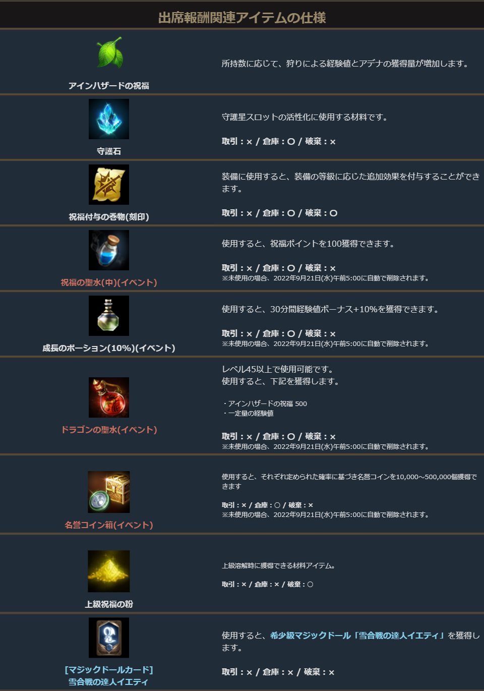 ※一部アイテムが期間終了後も未使用の場合、一定期間が経過すると自動で削除されます。詳しくは各アイテムの詳細をご確認ください。