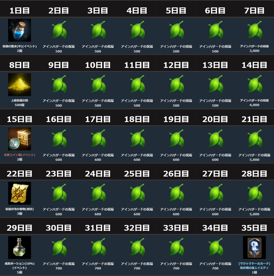 36日目以降は、出席報酬として以下の報酬を受け取ることができます。