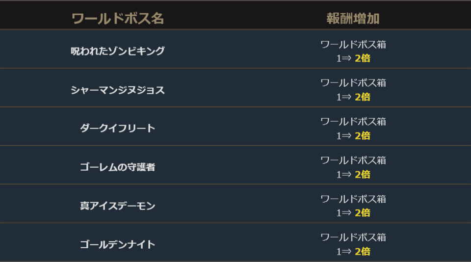 期間中、各種ワールドボス討伐時にもらえる「ワールドボス箱」の個数が2倍になります。