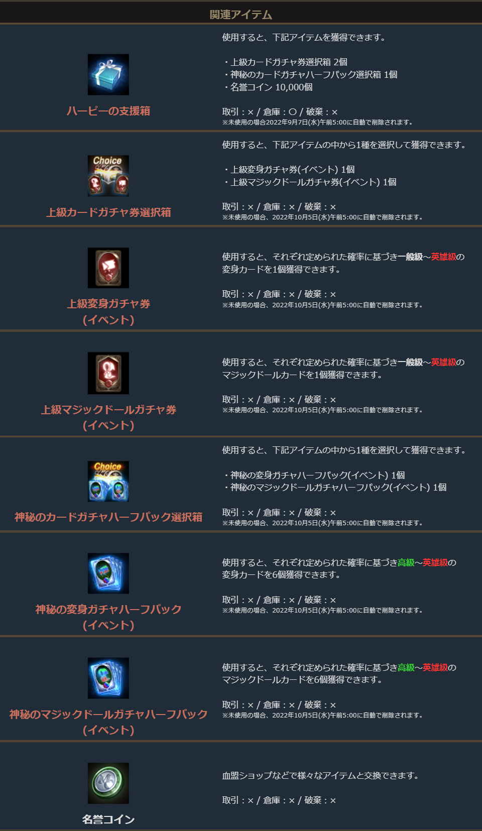 ※一部アイテムは未使用の場合、一定期間が経過すると自動で削除されます。詳しくは各アイテムの詳細をご確認ください。
