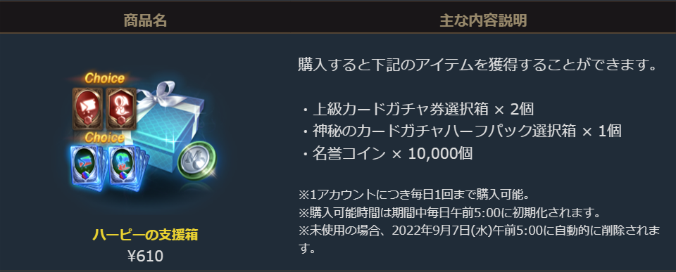毎日購入可能で、神秘のカードガチャハーフパックと上級ガチャ券がセットになったお得なパッケージです。