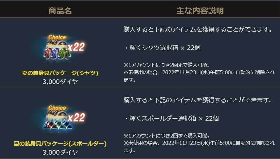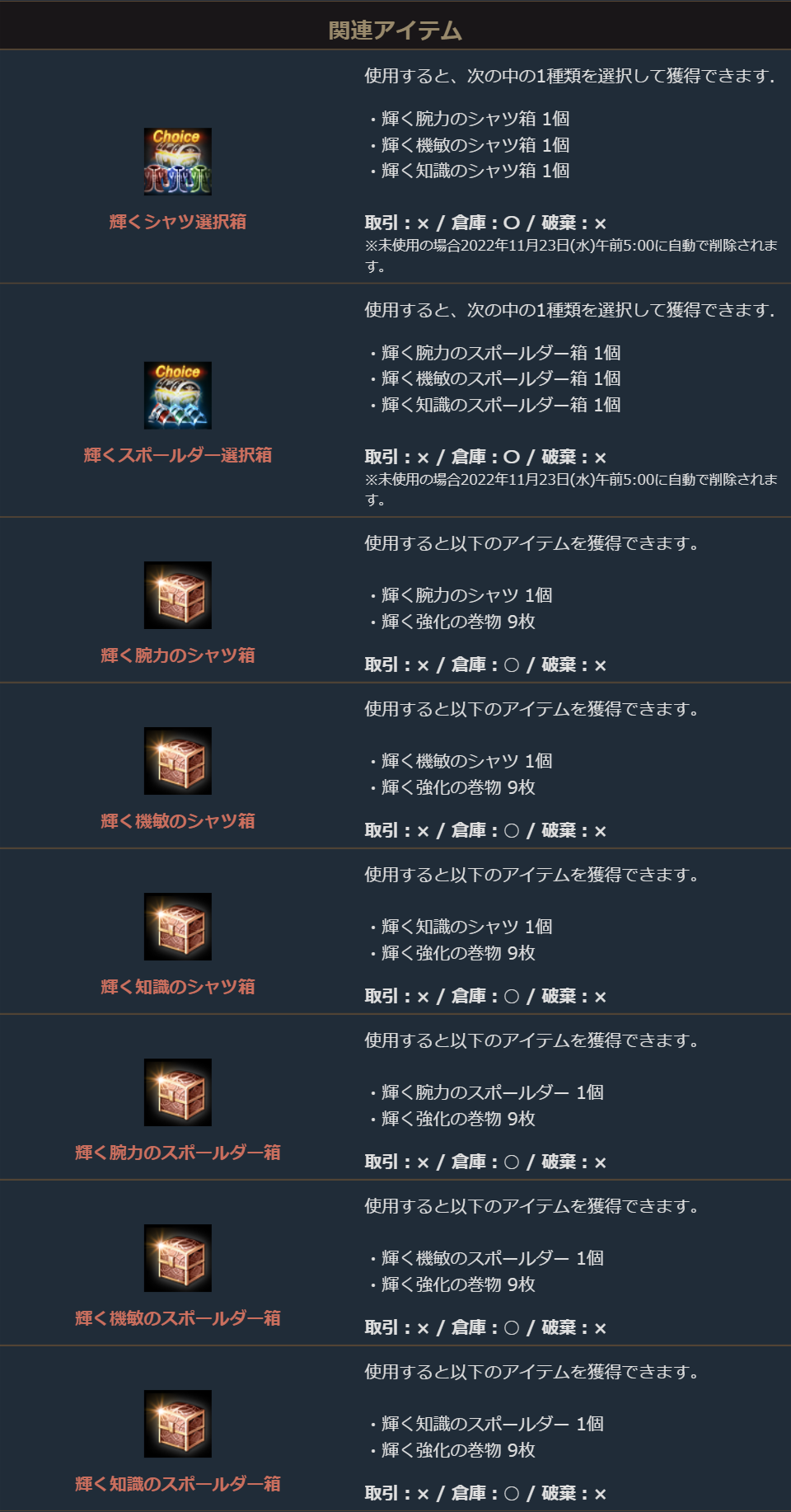 各種「輝くシャツ」と「輝くスポールダー」をお得に獲得できる商品となっておりますので、所持してない方や強化に挑戦したい方はお見逃しなく!