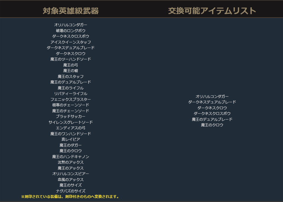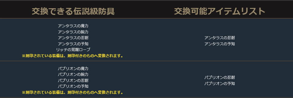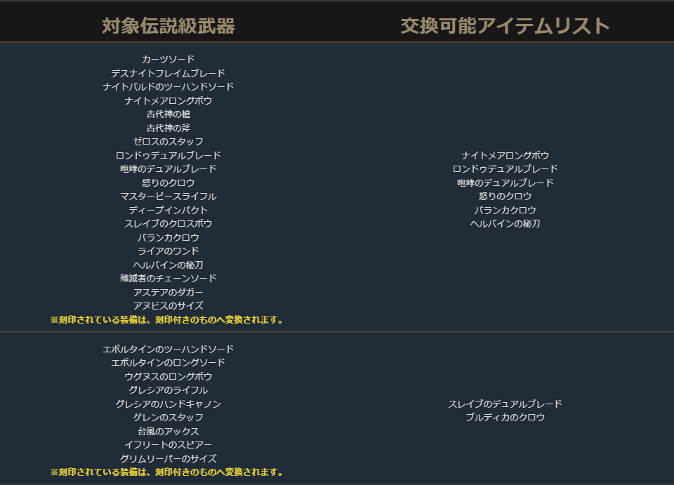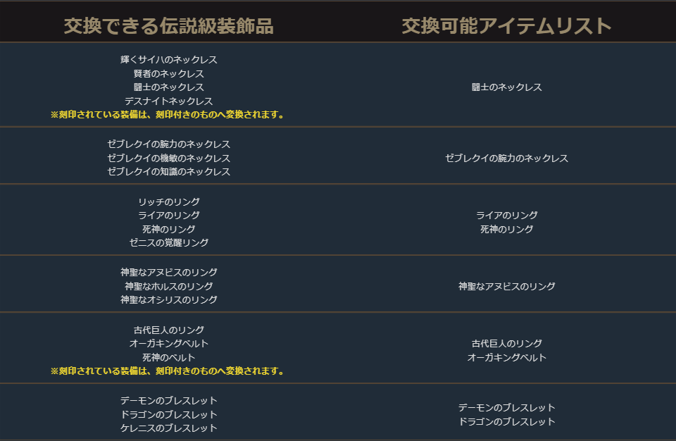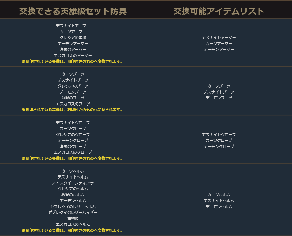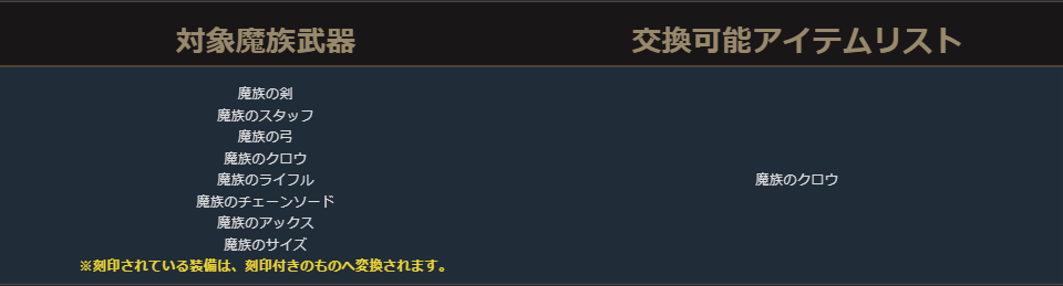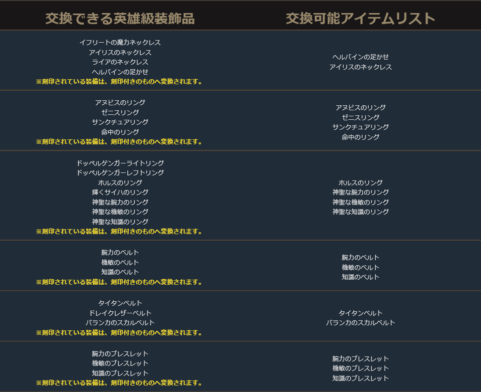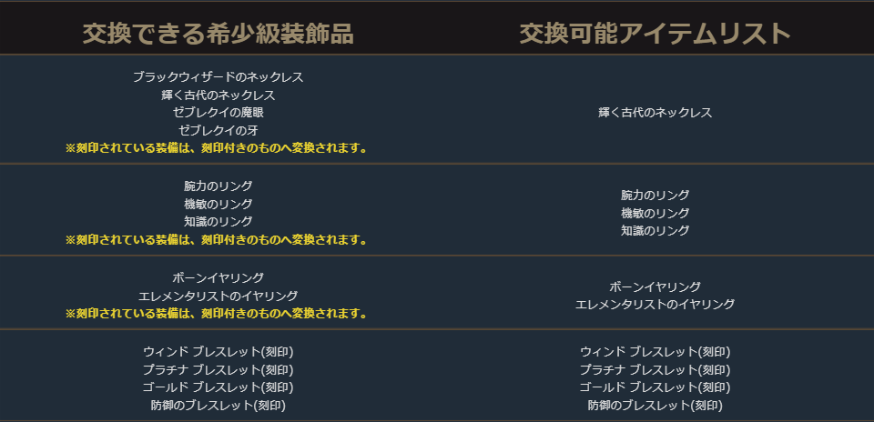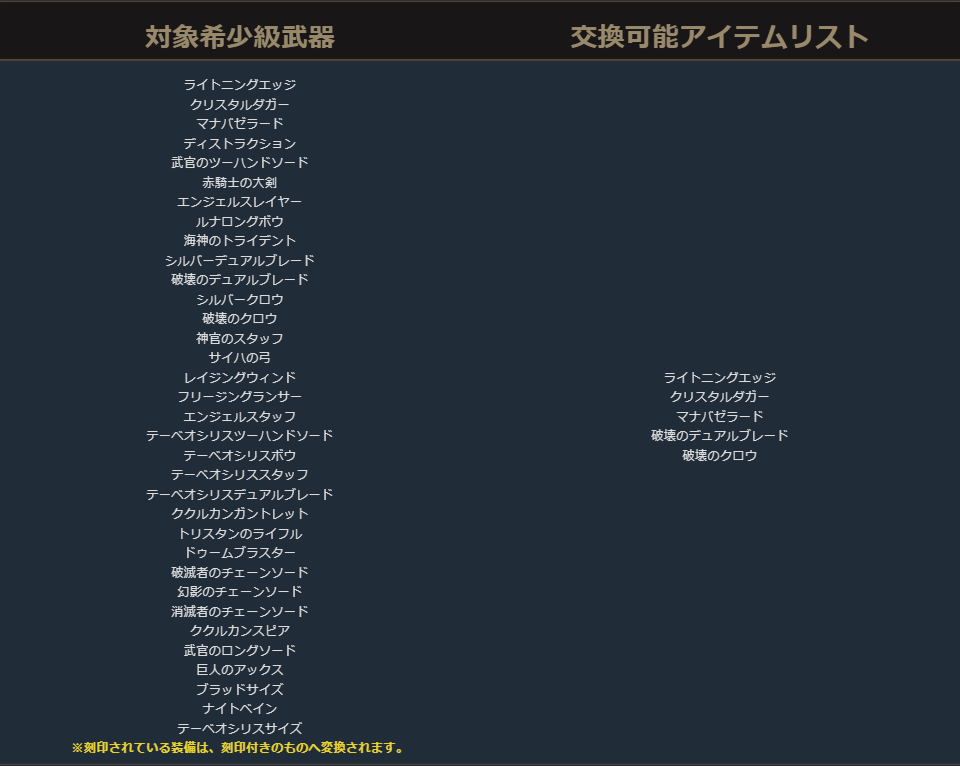クラスチェンジを行う際に交換可能なアイテムは、下記の希少級以上のクラスチェンジ前のキャラクターが装備可能なアイテムが対象となります。