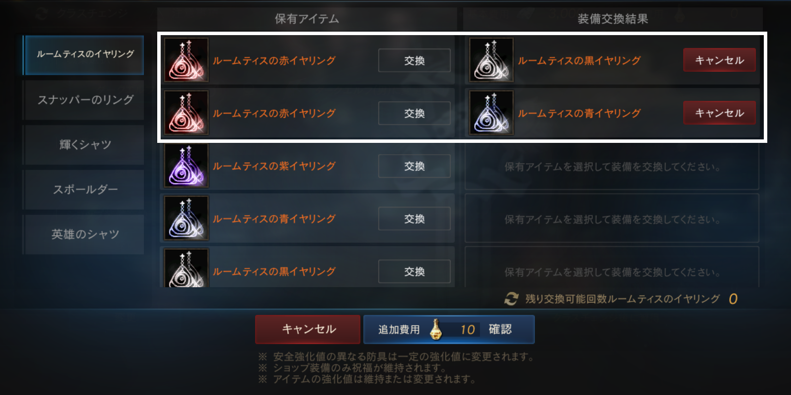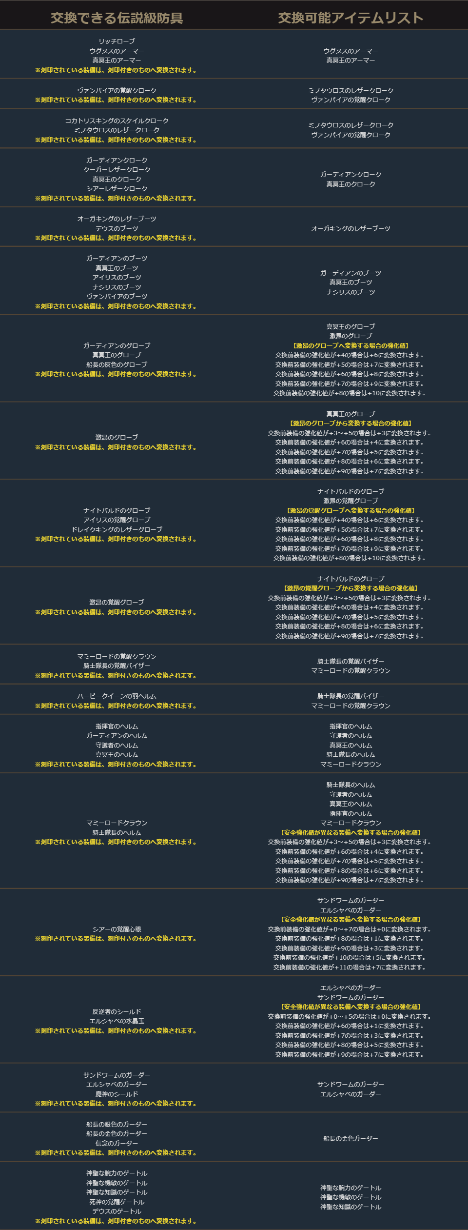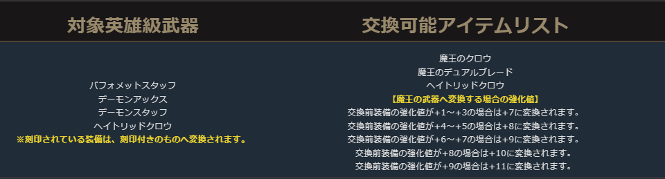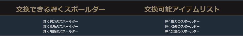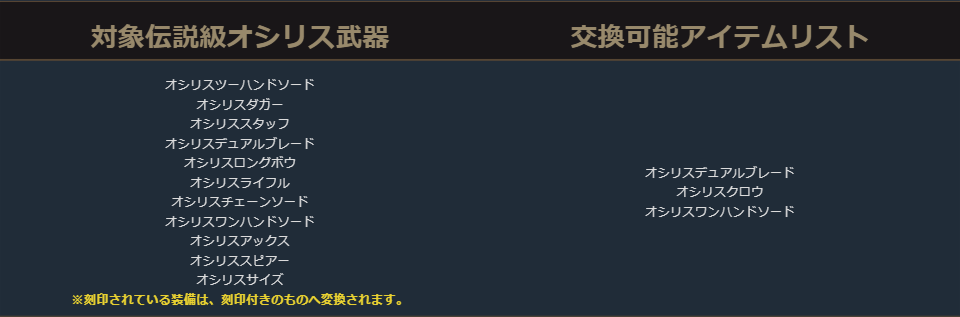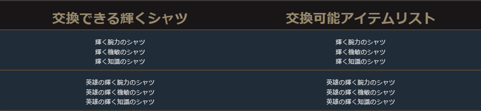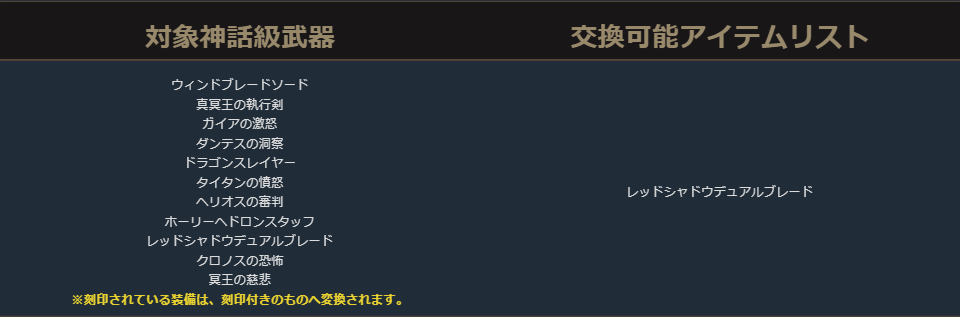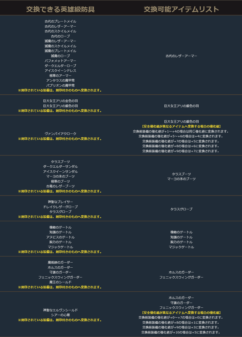 クラスチェンジを行う際に交換可能なアイテムは、下記の希少級以上のクラスチェンジ前のキャラクターが装備可能なアイテムが対象となります。