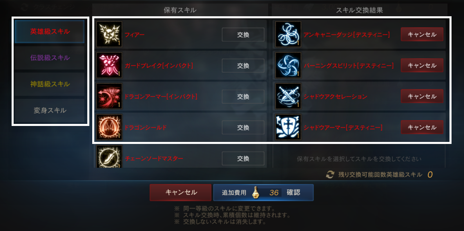 英雄級以上の習得済みスキルは、同一等級のスキルへ変換できます。