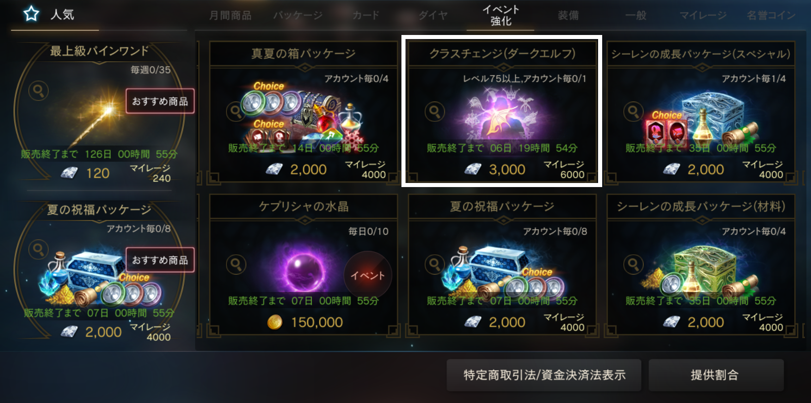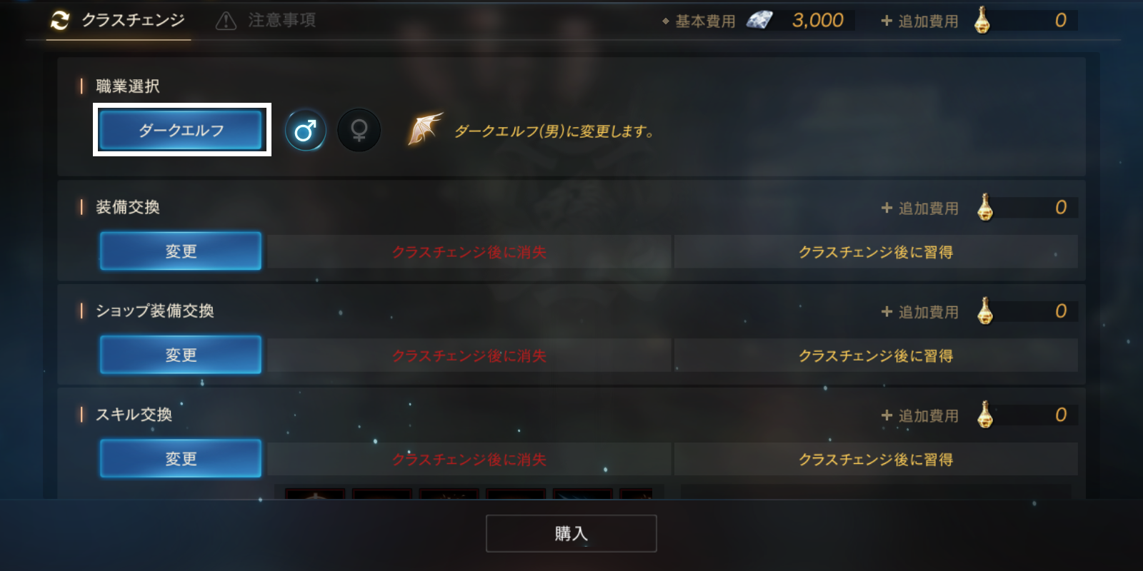 クラスチェンジとは、商品を購入したキャラクターの職業を、キャラクター名と経験値を維持したまま「ダークエルフへ変更」するサービスです。