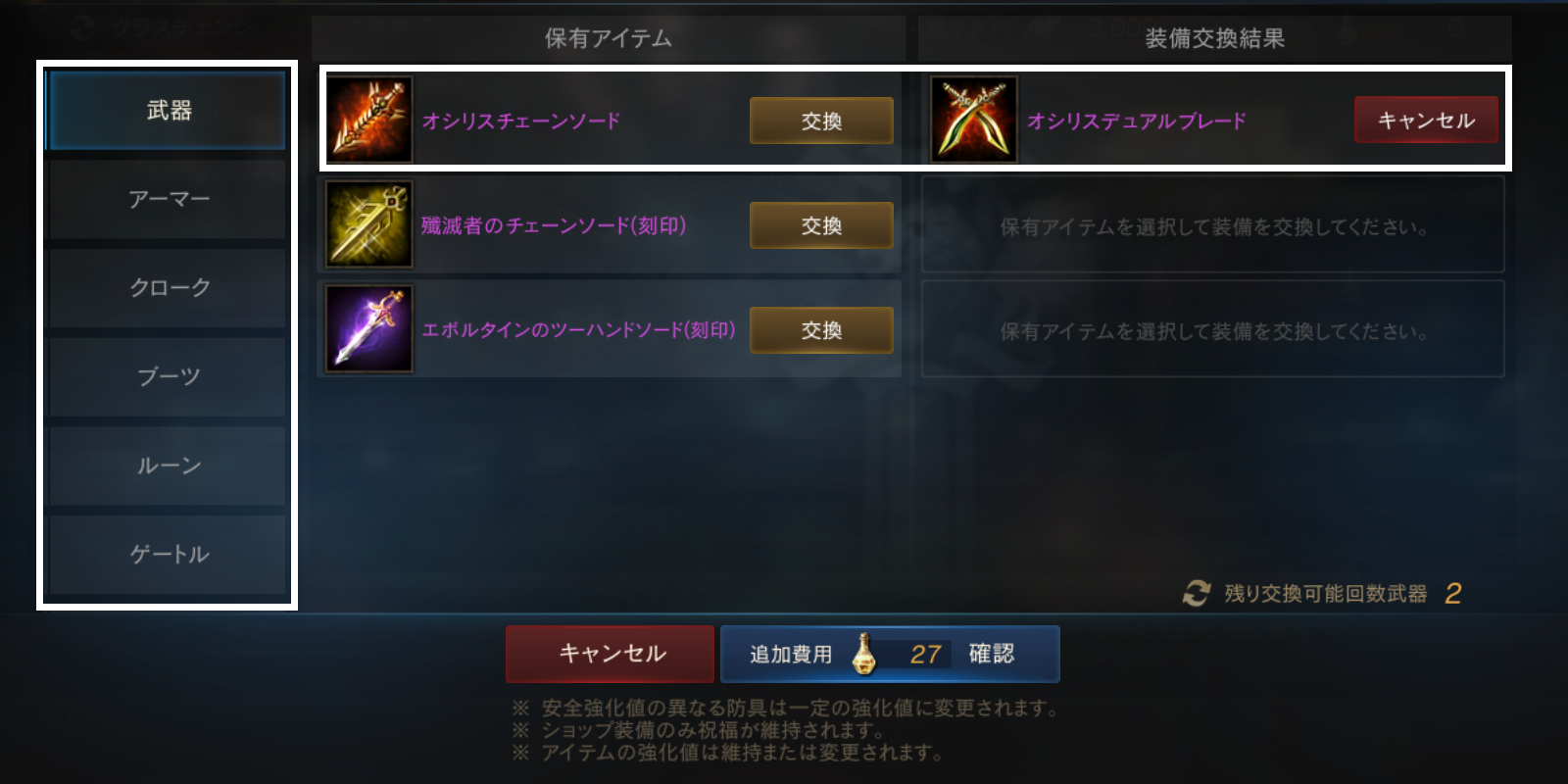 なお、現在の職業で装着できない装備の交換はできません。
