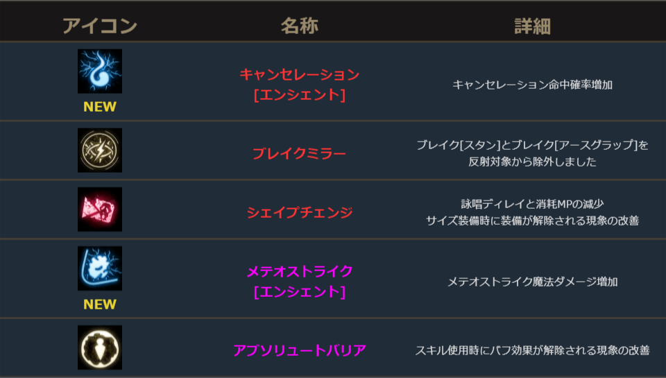 魔術師は新スキル2種追加、既存スキル3種変更。