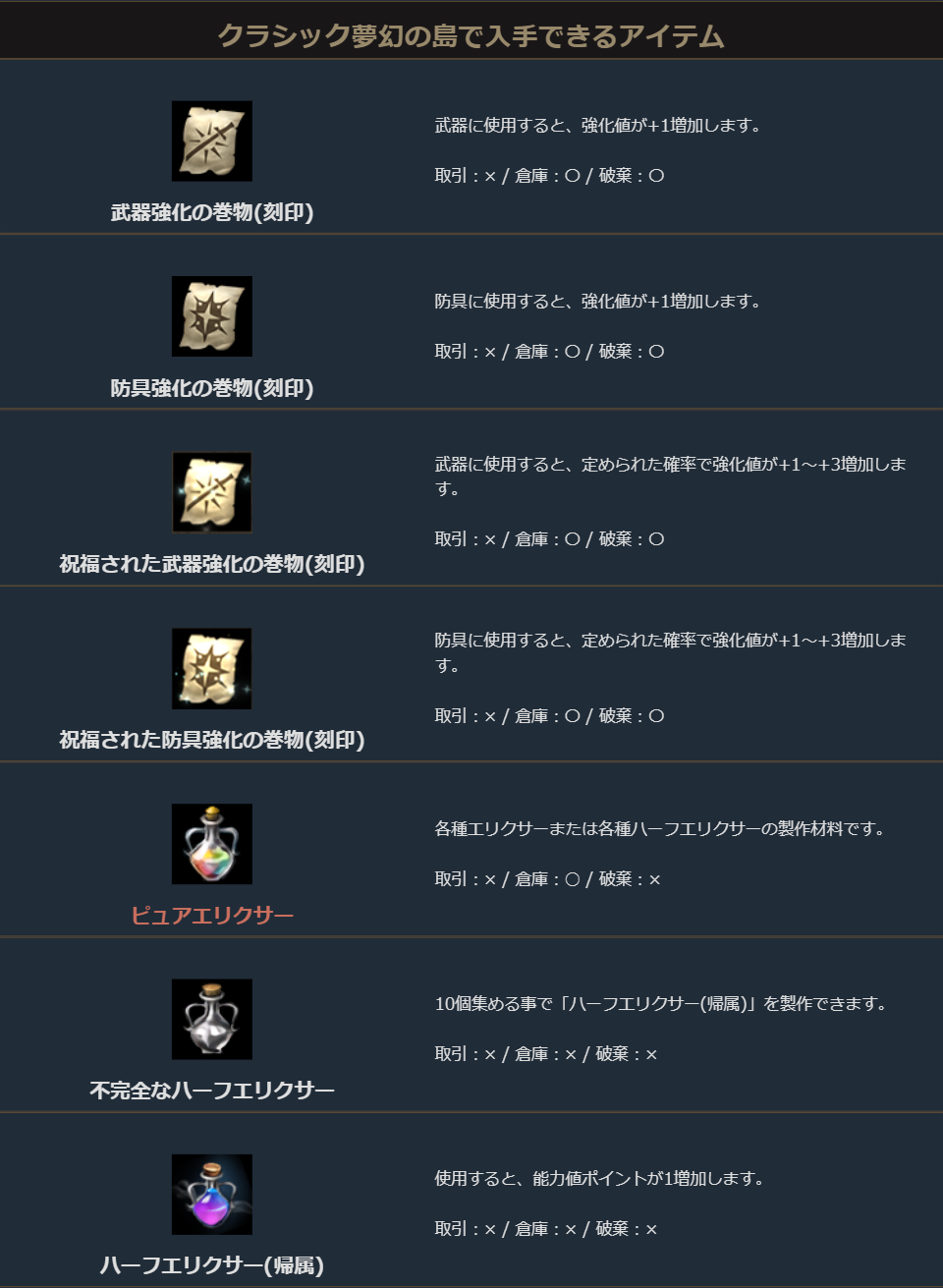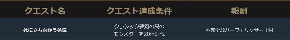 クラシック夢幻の島で進行可能なクエストをクリアし「不完全なハーフエリクサー」を集める事で「ハーフエリクサー(帰属)