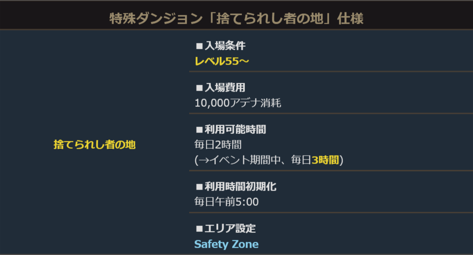 イベント期間中、特殊ダンジョン「捨てられし者の地」「夢幻の島」「古代精霊の墓」の利用可能時間が延長になります。