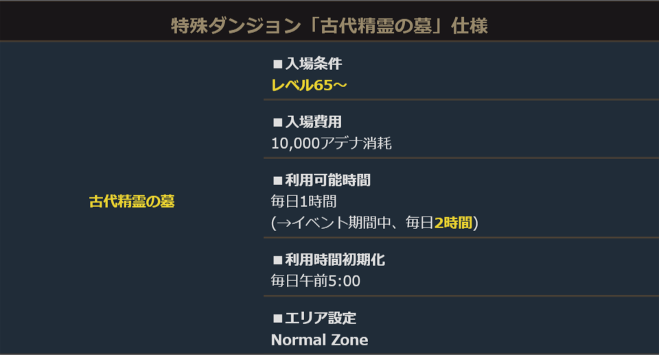 「古代精霊の墓」はレベル65~で利用可能な特殊ダンジョンです。