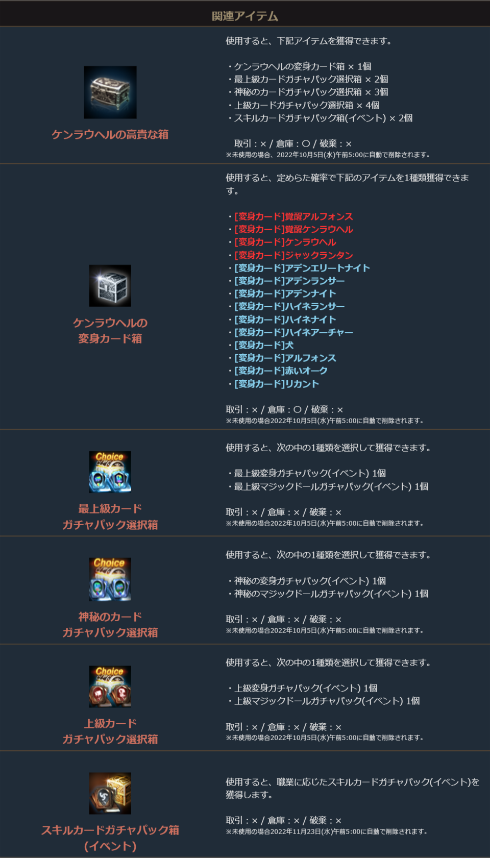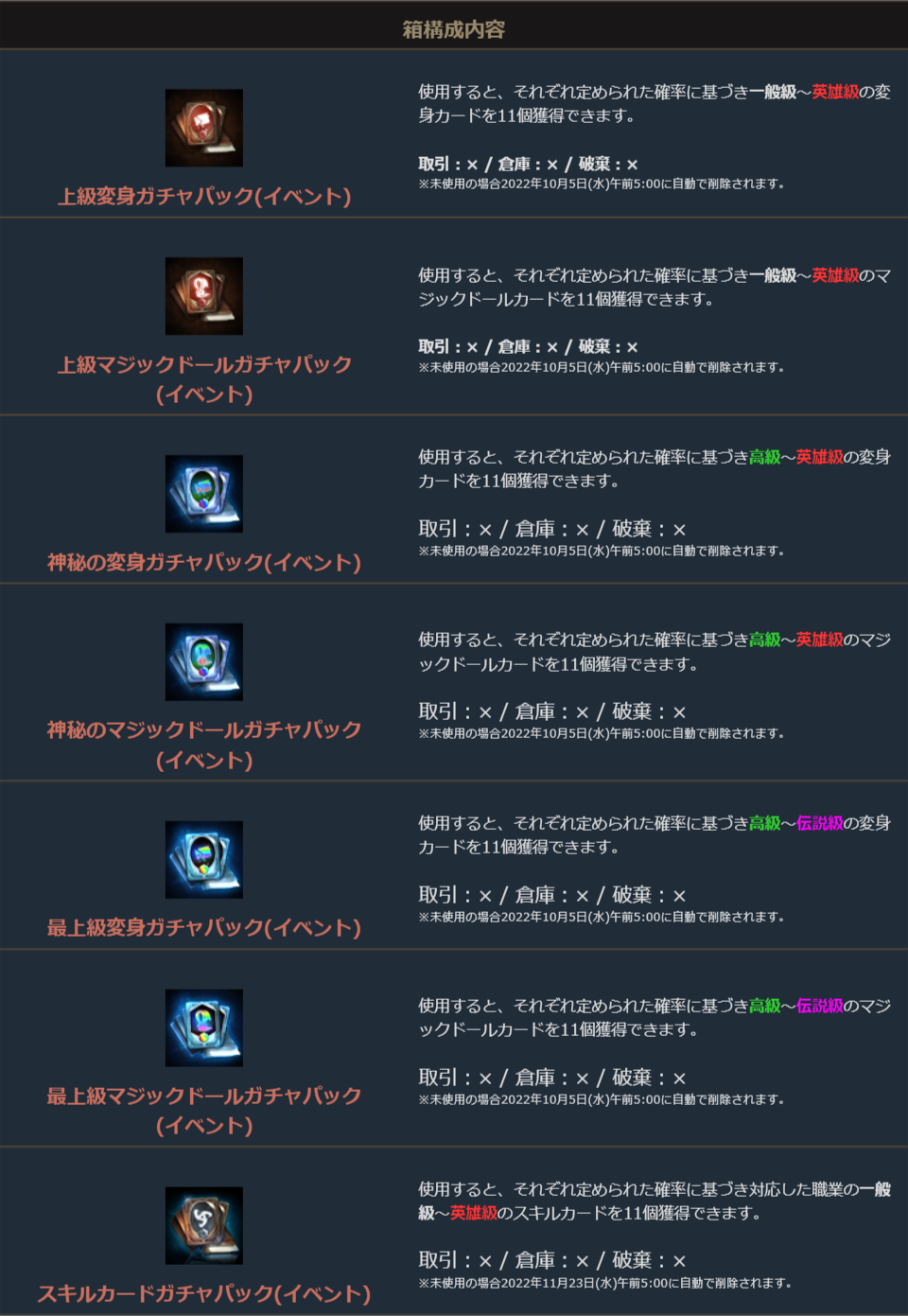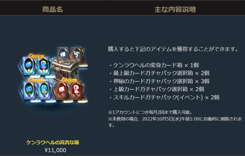 「最上級カードガチャパック選択箱」「神秘のカードガチャパック選択箱」「上級カードガチャパック選択箱」に加え「スキルカードガチャパック箱(イベント)」の4種類が複数個獲得できるお得なパッケージです。