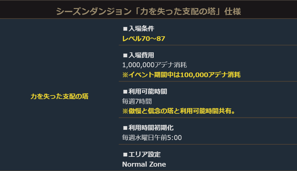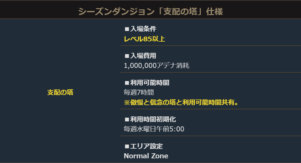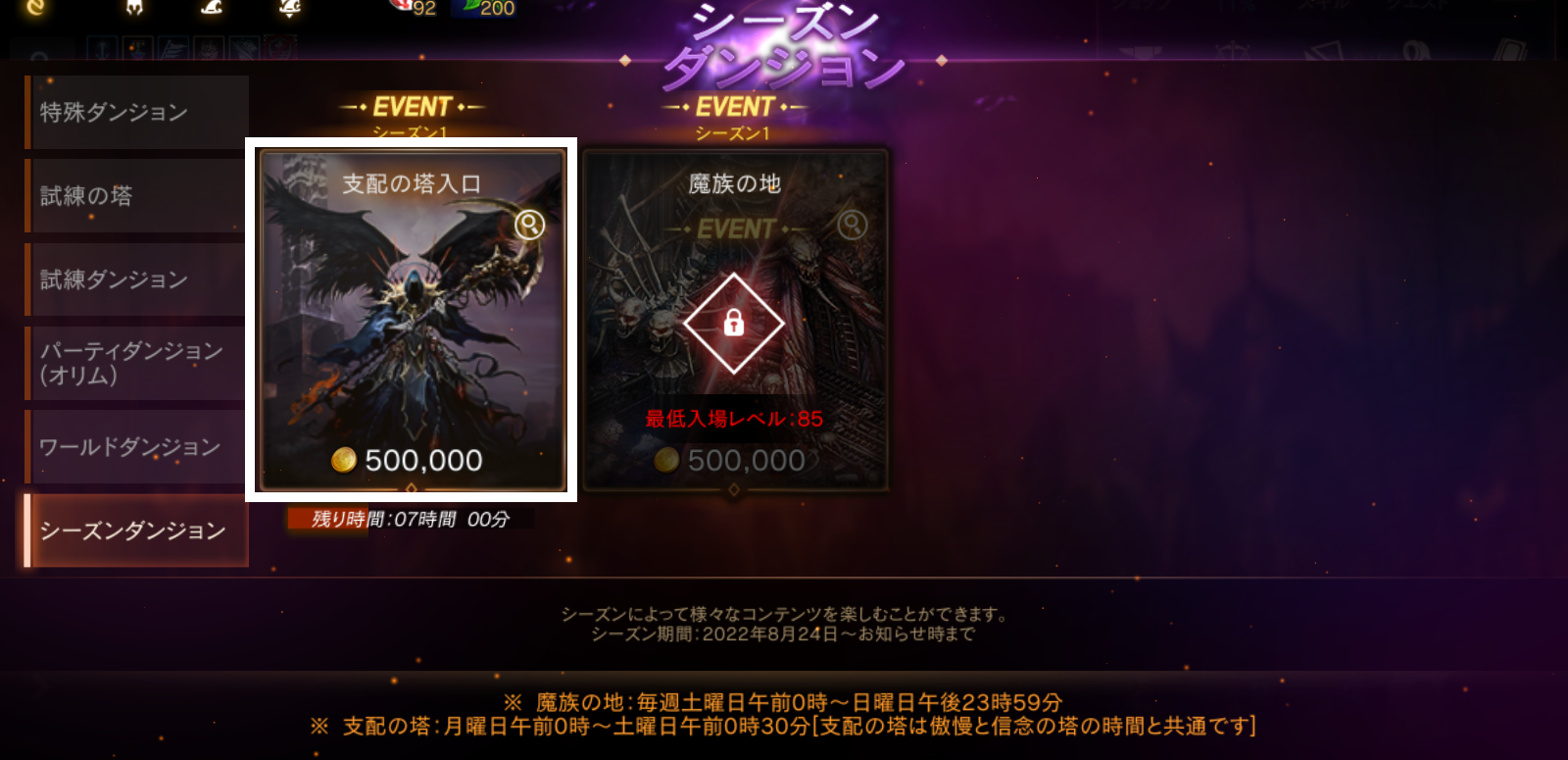 期間中、レベル85以上のキャラクターは「メニュー>ダンジョン>シーズンダンジョン」より「支配の塔入口」へ入場できます