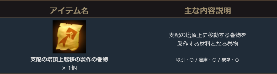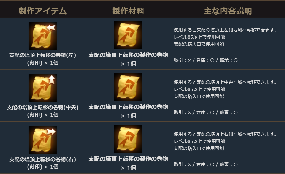「支配の塔頂上転移の巻物」を利用して下記の各種アイテムを製作が可能になっており、ポータル出現時間に関係なく「支配の塔入口」にてアイテムを使用する事で「支配の塔」へ入場が可能です。