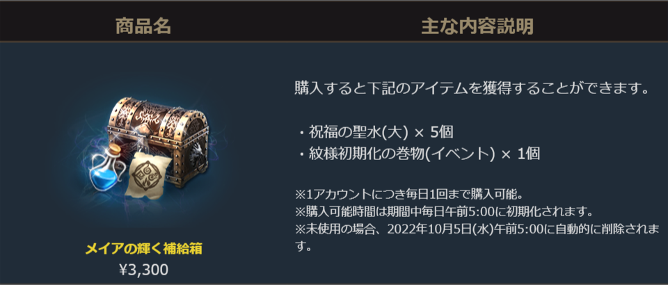 毎日購入可能で、紋様の強化や初期化に役立つ各種アイテムがが獲得できるパッケージです。
