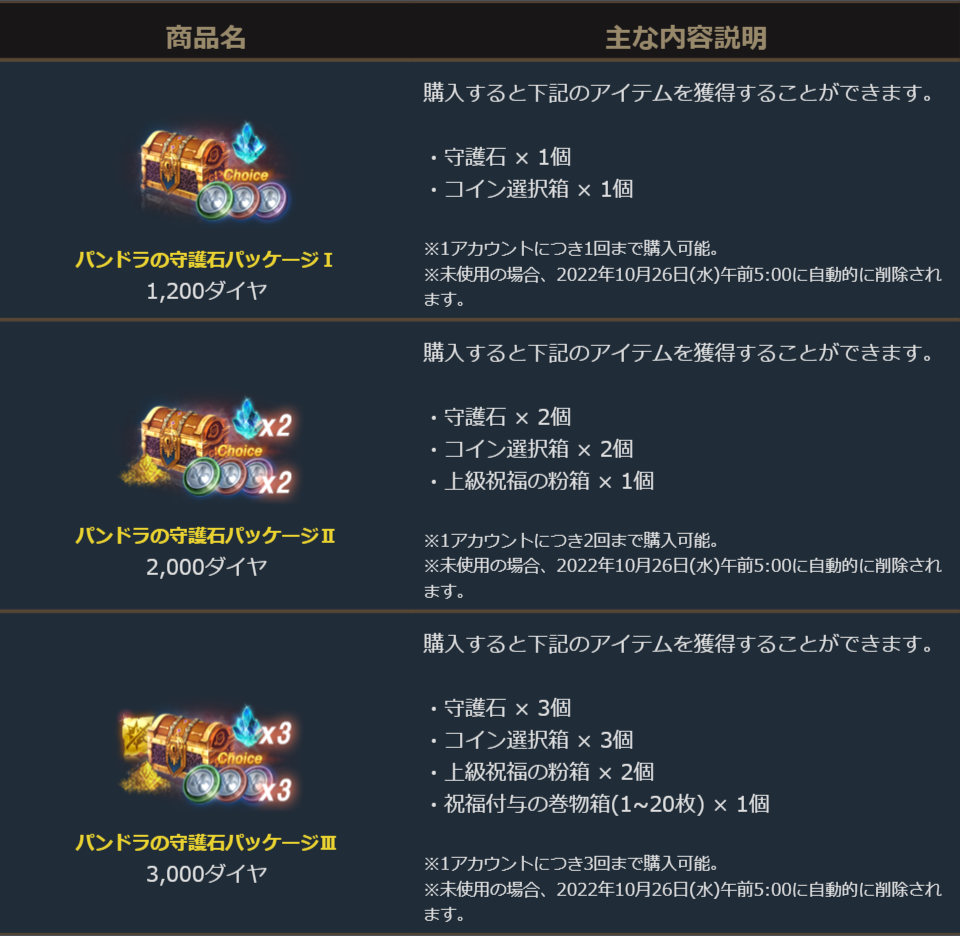 「守護石」と「コイン選択箱」のセットから、購入毎に獲得できるアイテムの個数と「上級祝福の粉箱」や「祝福付与の巻物箱(1~20枚)」と種類が増えていくステップアップパッケージとなっているお得なパッケージです。