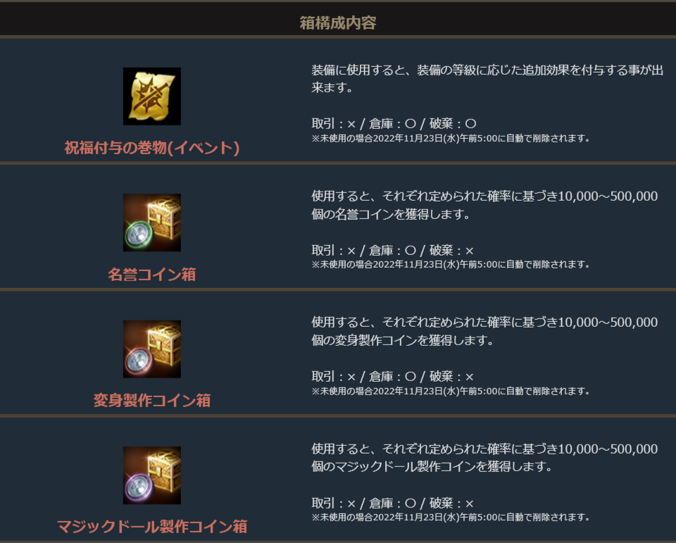 ※一部アイテムは未使用の場合、一定期間が経過すると自動で削除されます。詳しくは各アイテムの詳細をご確認ください。