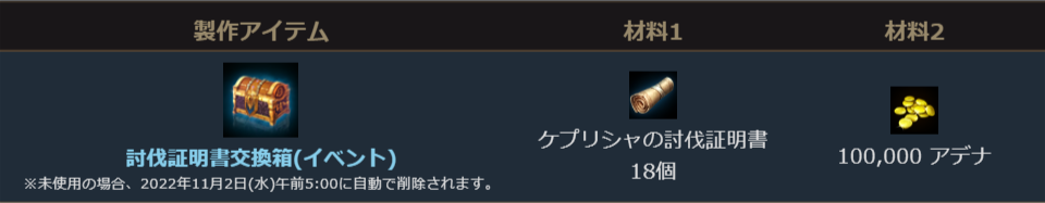 「ケプリシャの討伐証明書」を集めて「ケプリシャの討伐証明箱」を製作しましょう!