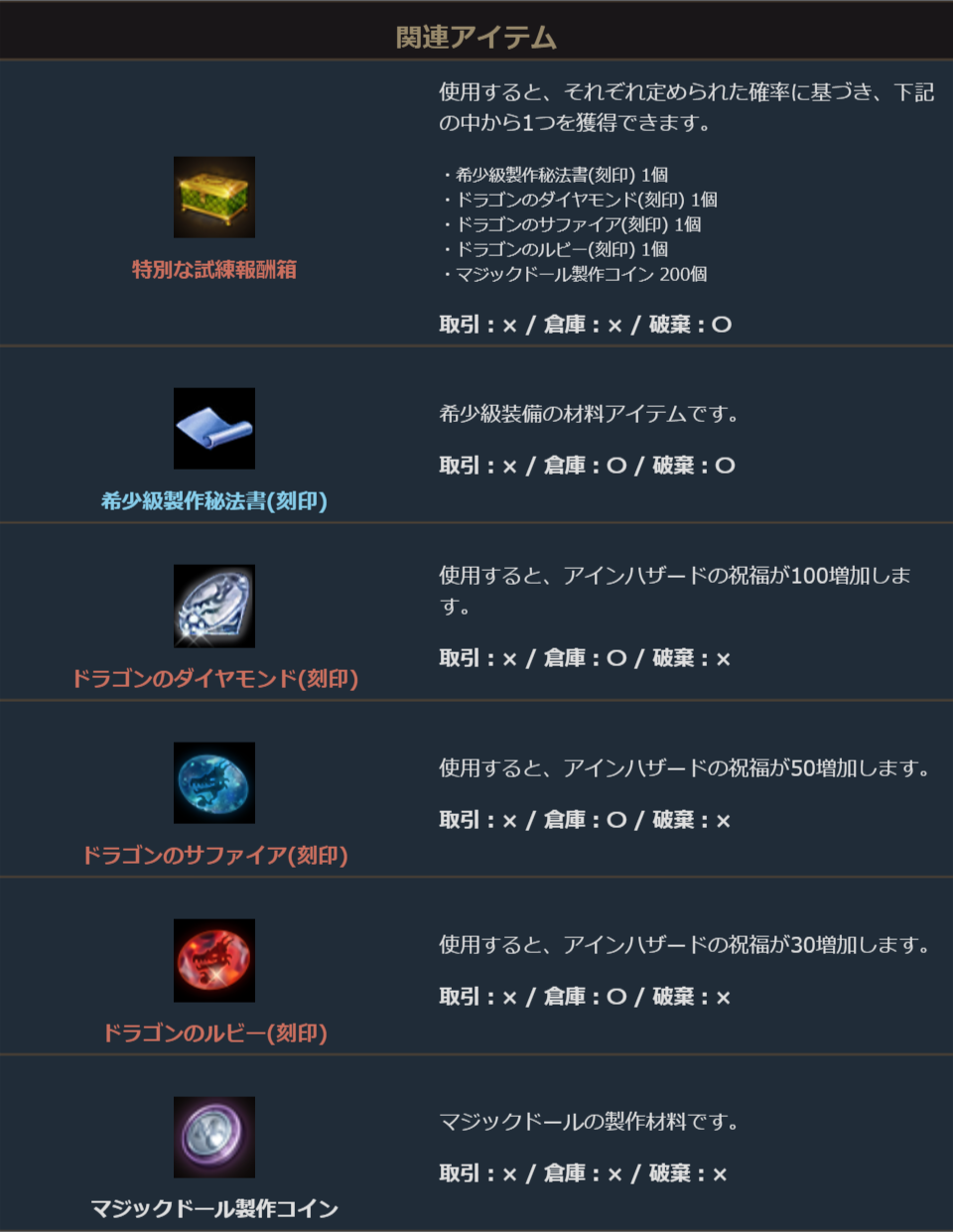 また、クリア時に下記の報酬が定められた確率で手に入る「特別な試練報酬箱」が入手できます。