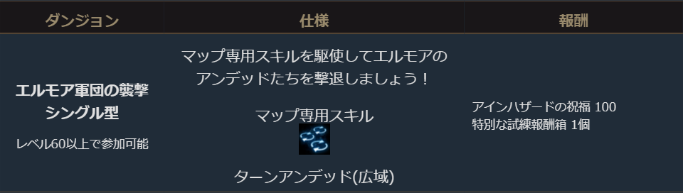 「メニュー > ダンジョン > 試練ダンジョン」より、「エルモア軍団の襲撃」に挑戦できます。